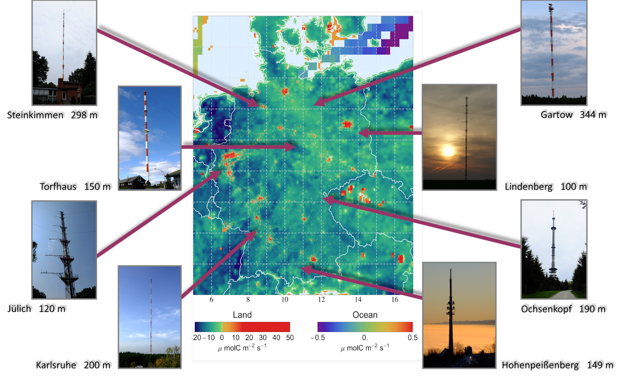 Die hinterlegte Deutschlandkarte zeigt beispielhaft den Netto-Fluss an Kohlendioxid (CO2) am Mittag eines Sommertags. Die Landbiosphäre erscheint zu diesem Zeitpunkt als Senke (Grün und Blau) weil die Vegetation durch die Photosynthese der Blätter CO2 aufnimmt. Auch in Nord- und Ostsee wird CO2 durch das Wachstum der Algen gebunden. In Städten überwiegt der anthropogene Ausstoß von CO2 durch Verkehr, Kraftwerke und Industrie. Diese Gebiete erscheinen in Gelb, Orange oder Rot auf der Karte. Viel befahrene Autobahnen sind als dünne gelbe Linien zu erkennen. Grundlagen solcher Karten sind Modellrechnungen, die an den Langzeitmessungen von ICOS kalibriert und überprüft werden.
